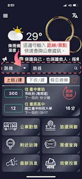 台中公车 uygulaması, 台中市政府 tarafından sunulan yenilikçi bir ulaşım ve seyahat uygulamasıdır. Tamamen reklamsız olan bu uygulama, kullanıcılarına 台中公车 ile ilgili anlık bilgiler ve çeşitli toplu taşıma hizmetlerini bir arada sunarak daha kolay ve akıllı bir ulaşım deneyimi sağlar. Uygulama, kullanıcıların otobüs dinamiklerini, güzergah planlamasını ve yakın durak bilgilerini kolayca görüntülemelerine olanak tanır. Ayrıca, 台中 metrosu, 台铁 ve 高铁 gibi diğer ulaşım seçeneklerinin sefer bilgileri de kullanıcılarla paylaşılmaktadır.